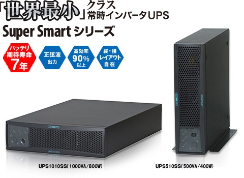 UPS Super Smart(SS)シリーズは、出力電力容量が同じクラスのものに比べ、体積1/2以下(当社比)になりました。『世界最小クラス』を実現した常時インバータ給電方式無停電電源装置です。