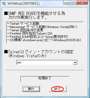Windows VistaではNo.1 Telnetサーバープログラムのインストールを実行後にWinSetupを実行してください。