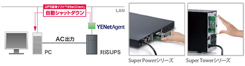 UPSの標準MIB(RFC1628)を装備している他、NTP(Network Time Protocol)に対応し、自動でタイムサーバと同期する。同社の高効率で省エネ対応のUPS新製品SuperPowerシリーズとSuperTowerシリーズに対応。UPS背面のスロット部にボードを差し込み、添付のUPS監視ソフト(YENetClient)をセットするだけで簡単にインストールと設定が可能。